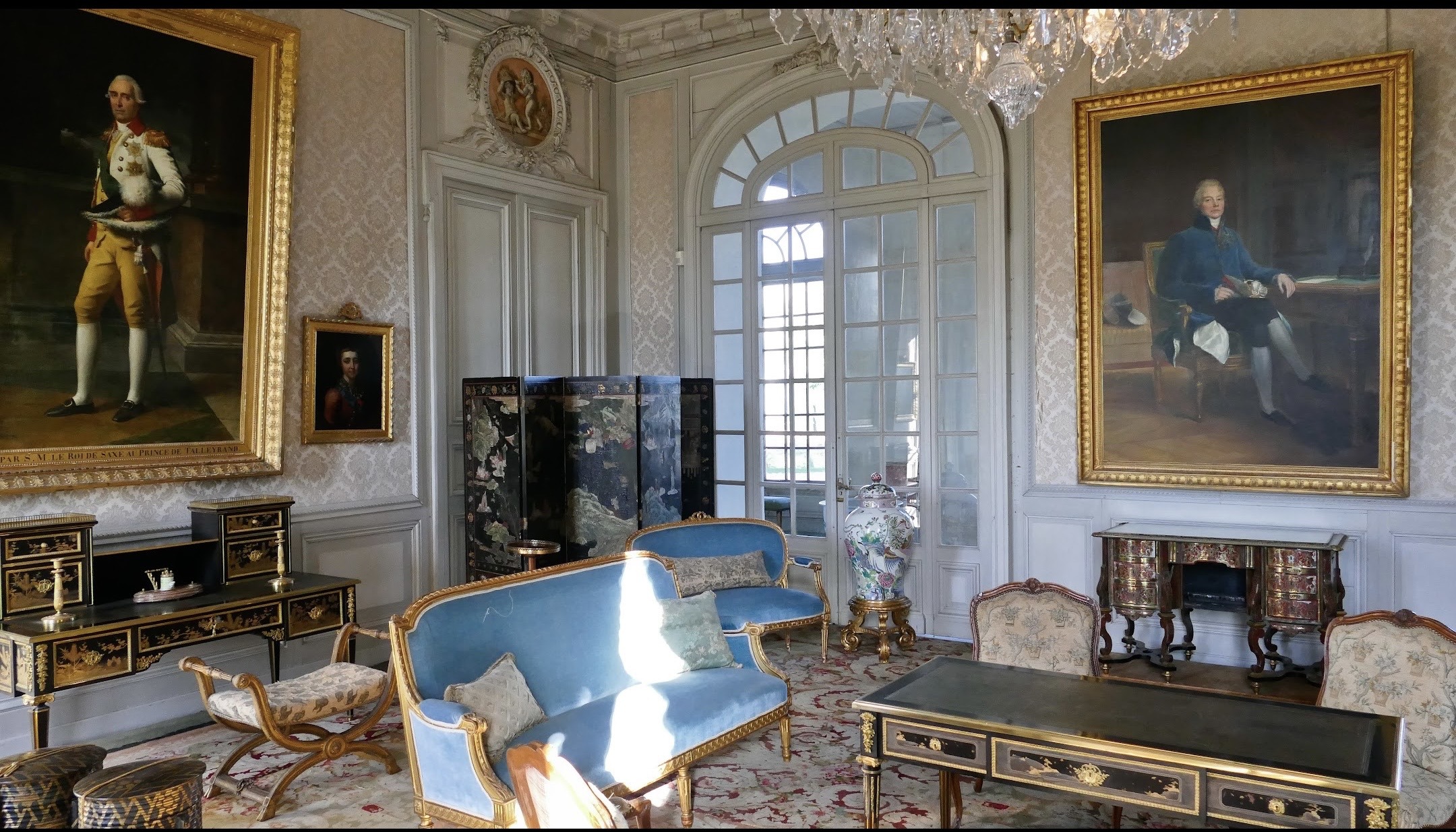 Abordons la visite par la cour nord qui offre une vue monumentale de l’édifice dont l’ampleur se révèle alors et traversons le jardin à la française réalisé en 1906 seulement. L’accès aux bâtiments se fait par la cour d’honneur qui s’ouvre vers de nouveaux jardins et regarde résolument vers le sud. Le bâtiment principal, orienté plein sud, est parcouru par une galerie, dite des portraits qui dessert l’ensemble des salons du rez-de-chaussée. Ornée de statues et bustes antiques, elle montre six portraits de famille commandés au peintre Joseph Chabord en 1817. Les grands salons se succèdent alors, le salon de musique avec son piano-forte de 1808 et une belle harpe de 1817, puis le salon bleu décoré de « chinoiseries », d’une merveille de table Louis XVI et d’un tableau représentant le maître des lieux. Il est suivi du grand salon, soutenu par deux colonnes et qui abrite un splendide bureau Mazarin du début du 18ème siècle, doté d’une marquèterie de cuivre et d’écaille rouge de tortue. Enfin, la galerie dessert la salle à manger qui accueillait jusqu’à 36 convives et est rehaussée de deux belles tapisseries de Beauvais attribuées à Canova.