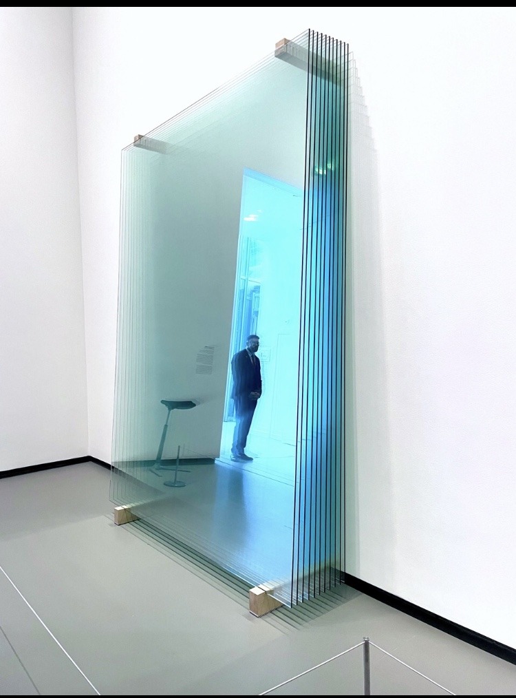 Un peu plus loin dans le parcours de l’exposition, nous voilà à nouveau aspirés par la surface réfléchissante de six vitres transparentes, (Six panneaux verticaux 2002/2011) accrochées devant un mur au moyen de fixations métalliques. Cette fois-ci, notre image n’est pas aussi nette et précise que celle réfléchie par le Miroir de 1981, mais c’est un reflet assez flou de soi-même que l’on voit sur la première vitre et qui se démultiplie sur les suivantes produisant un effet de perspective qui donne une profondeur à l’image qui s’y inscrit.